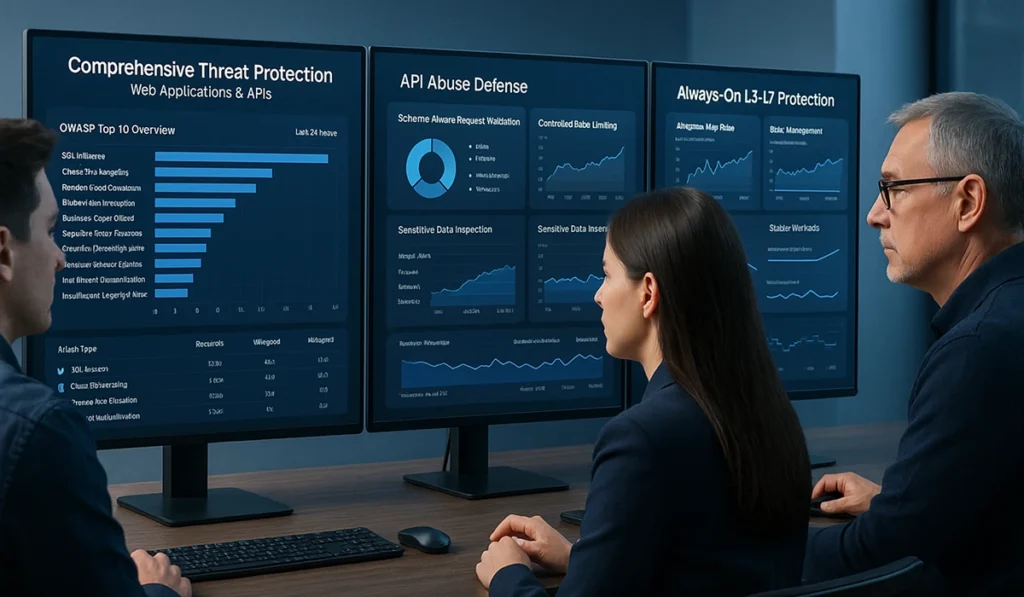 - Alwayson L3–L7 protection combining adaptive WAF, DDoS mitigation, and behavior‑based bot management—keeping AWS workloads stable through volumetric and targeted attacks. .